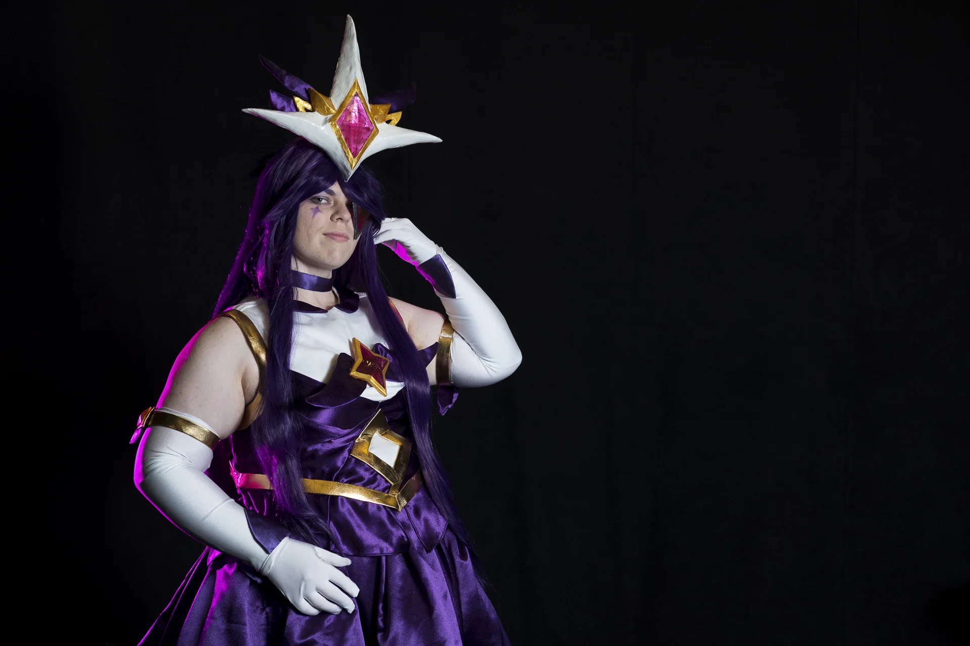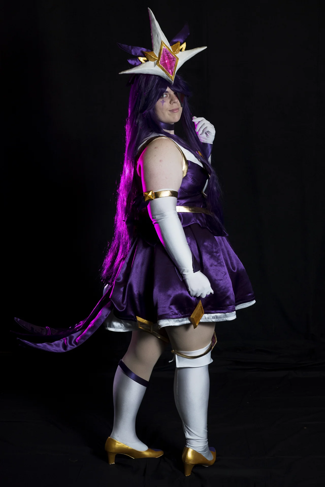 The key light was a Godox AD200 going through a Wescott 60" umbrella at 45 degrees to the subject. This time around instead of putting rim lights behind Ahri or Syndra I decided to try putting a Yongnuo YN560 90 degrees left or right with a colored gel to give a highlight effect. I really liked how the purple gel lended a nice highlight look to Syndra's hair.