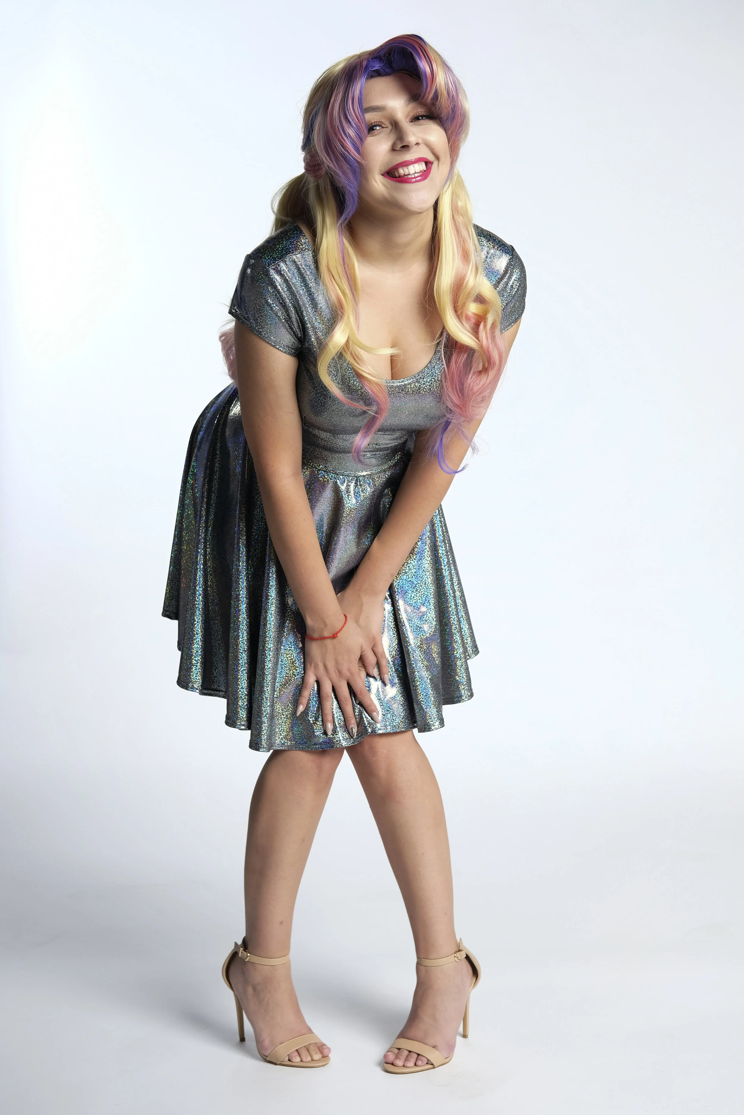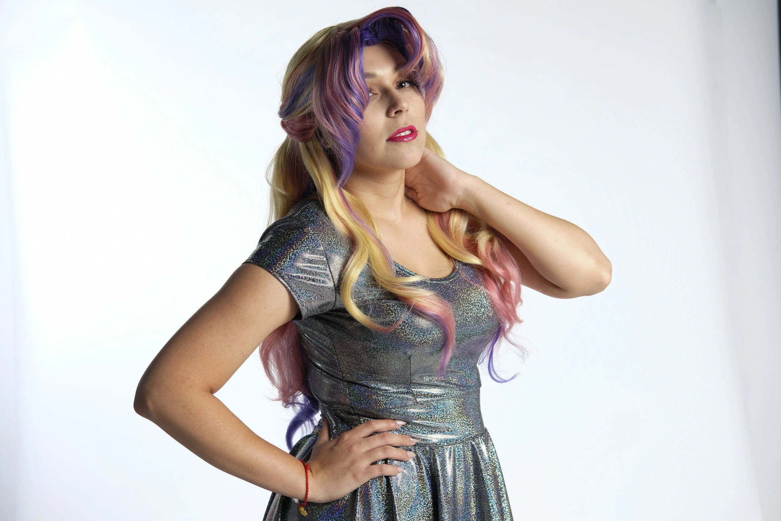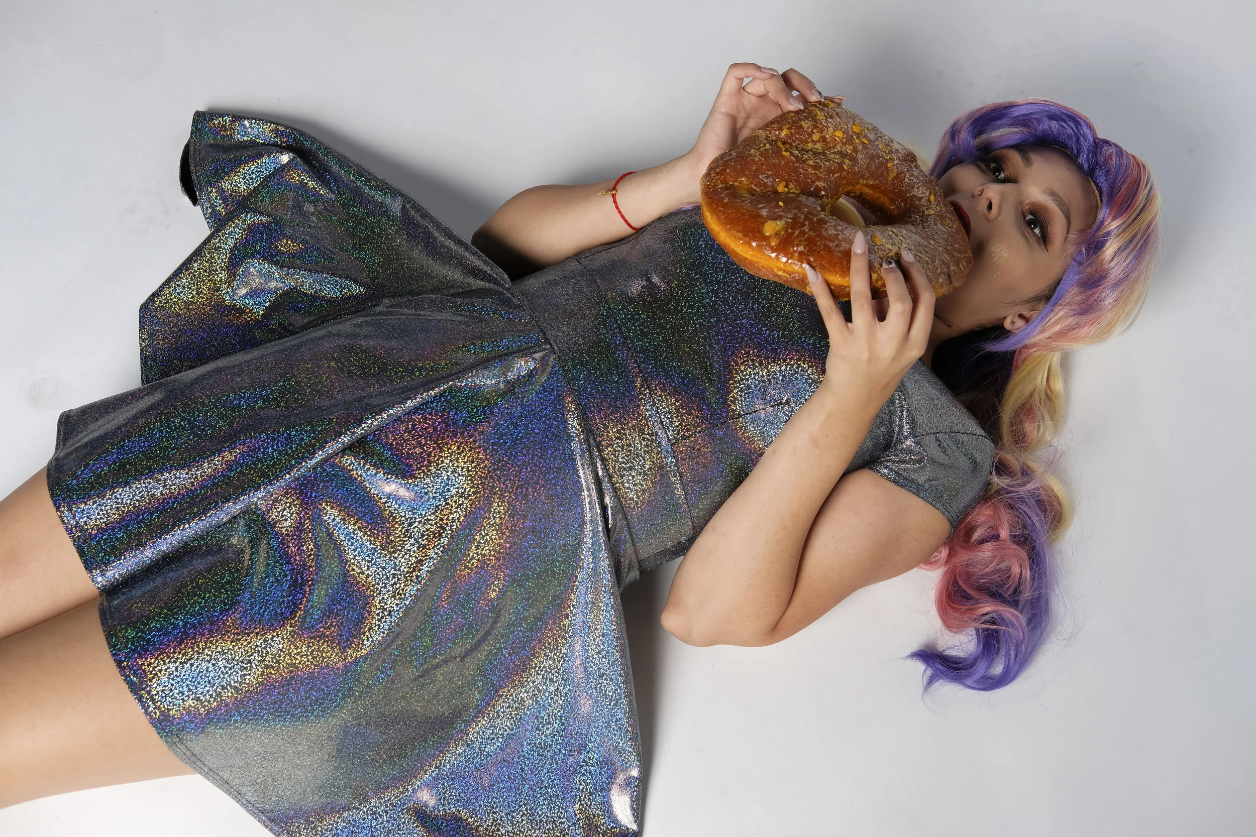 Then I remembered there were 'holographic' dresses out there where the base color would be silver but depending on how the light catches the material they could show off different colors. So there would be a good base color that would allow us to play with the color palette but yet could show off some colors on it's own. And it would certainly be eye catching like a well made donut. Thankfully we found a perfect dress for this from Coquetry Clothing.