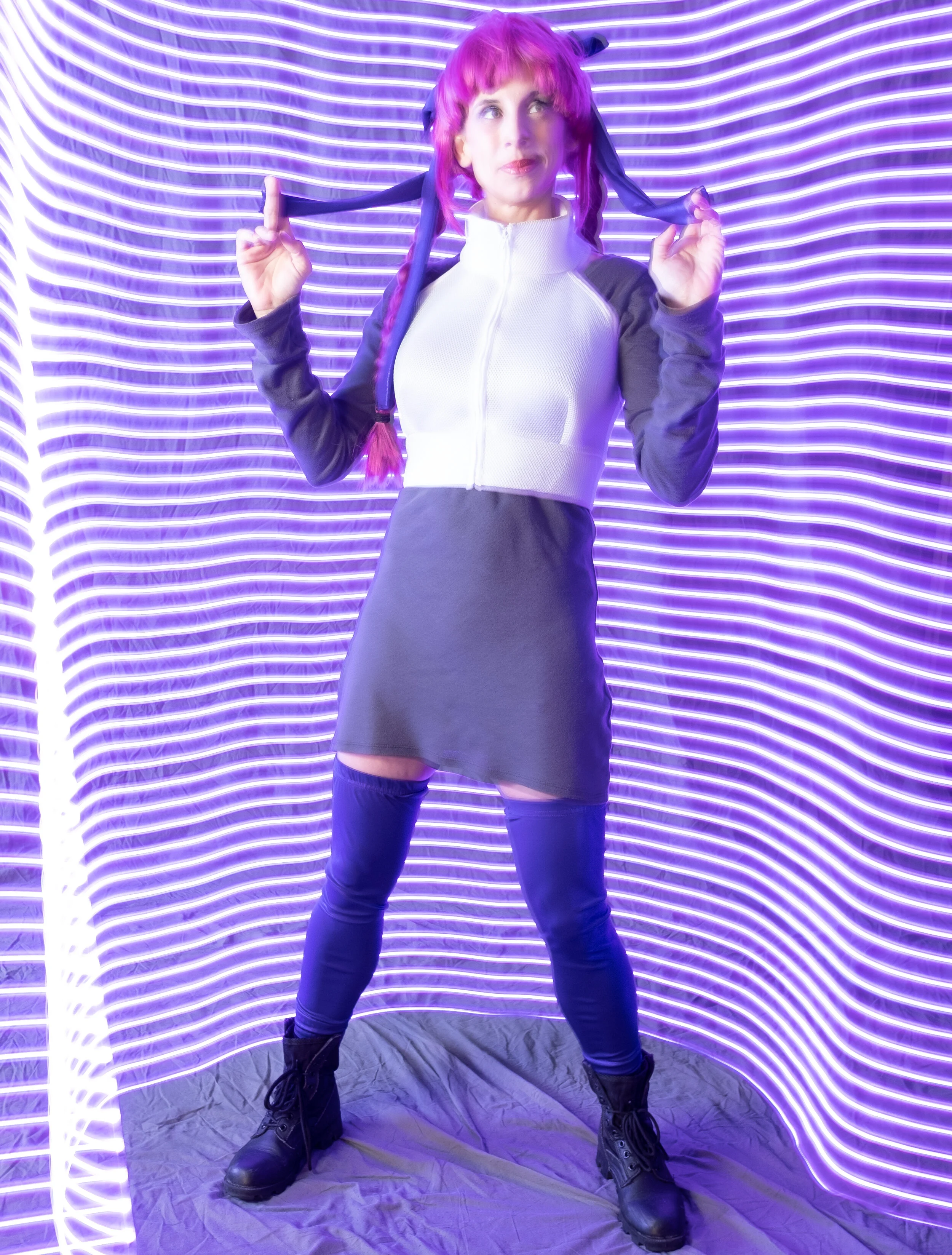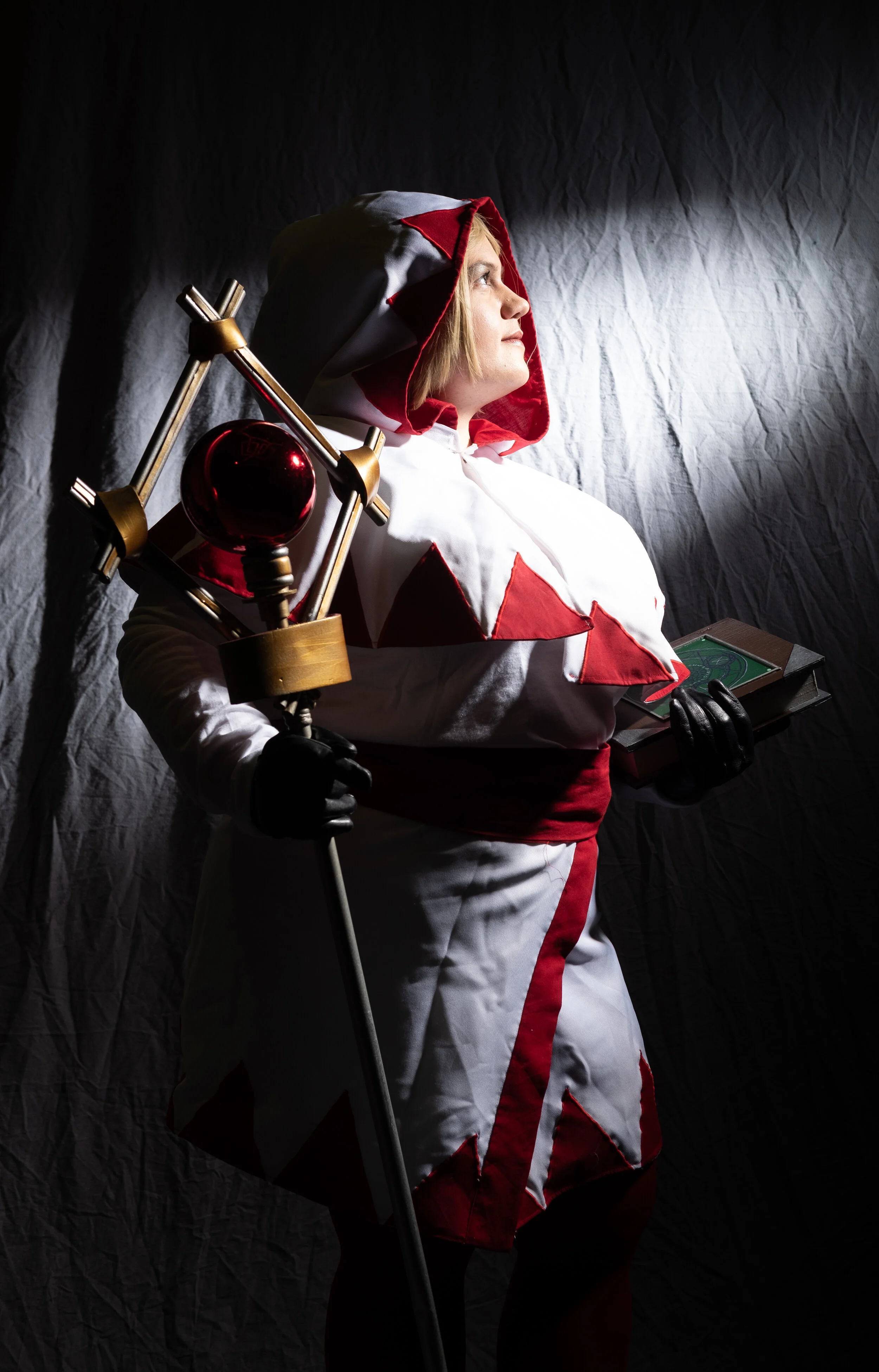 We brought in new pieces for this demo as well. A lot of what we applied here came from us running the photo booth at Anime On Ice along with bits from the Dark Elegance set. We wanted to play with ideas with shaping light and also in applying color. This gave us a chance to use a few new tools and techniques. One was using a Godox snoot with a honeycomb grid to apply a background element with the Final Fantasy White Mage. We used the Interfit 11" by 60" softbox to apply a neat color gradient for Tacocat as She-Ra. And for Misa from Death Note that was a gridded and diffused Phottix Raja 60 cm by 90 cm softbox feathered slightly off axis to give some neat shadow drama.