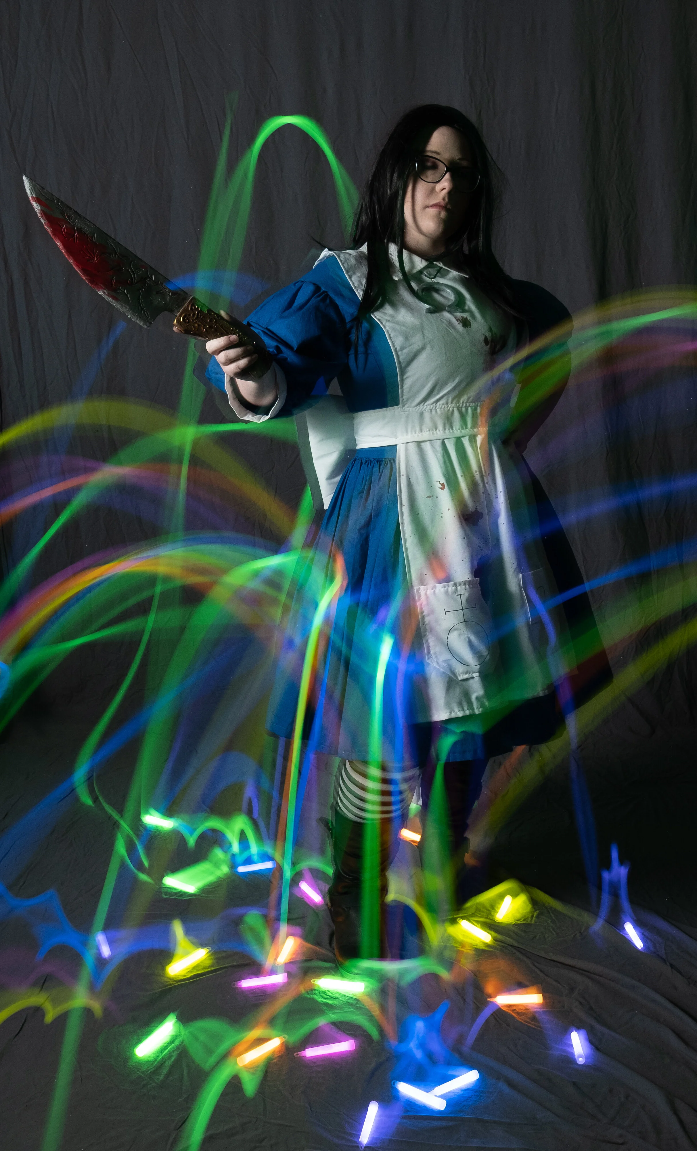 Lastly, we did have people throw glow sticks again. The ones we had this time around were much smaller. So some photo ideas didn't quite work while working with the person dressed as Alice. But somewhere in chatting with the audience during that part there came about a joke about throwing them at her. So I was just like "Fuck it, why not?" There was something about the smaller glow sticks bouncing across or laying on the floor that gave a neat effect though. So that's something to keep in mind.