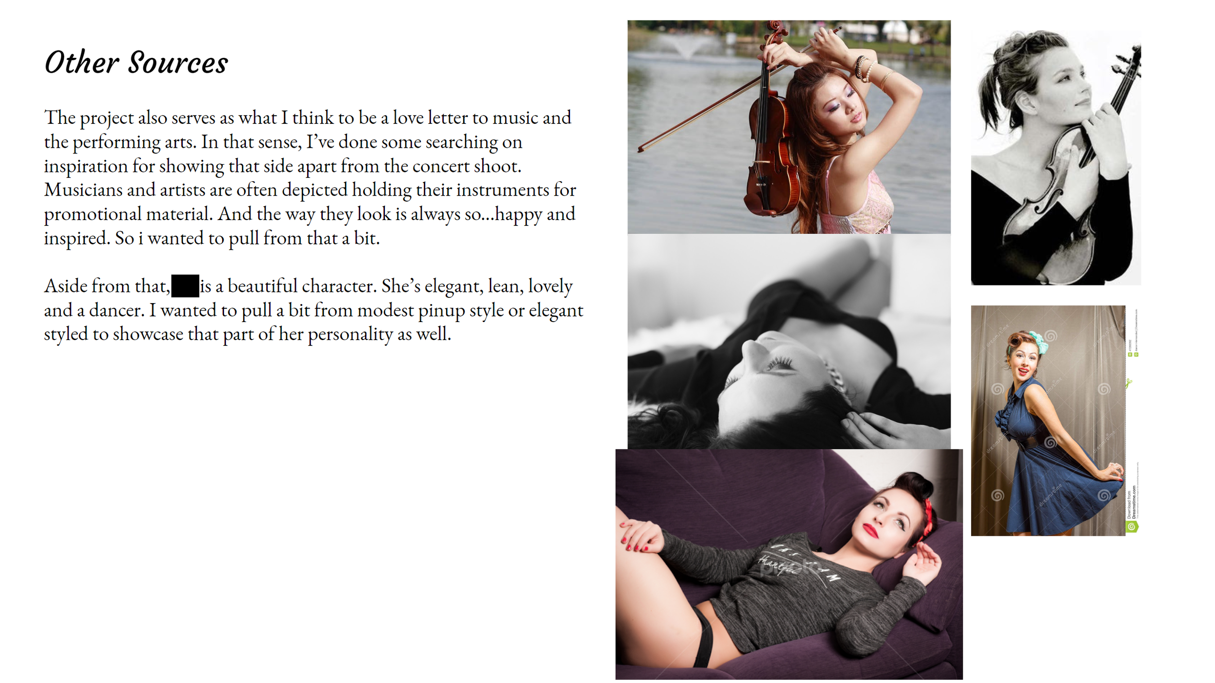 One project that we want to work on was heavily driven by Allybelle as a “love letter to music and theatre”. So a lot of what we both wrote about for the document reflected that, including a YouTube playlist for song ideas. Plus with how the character involved leans towards ‘sexy’ there were references to that as well.