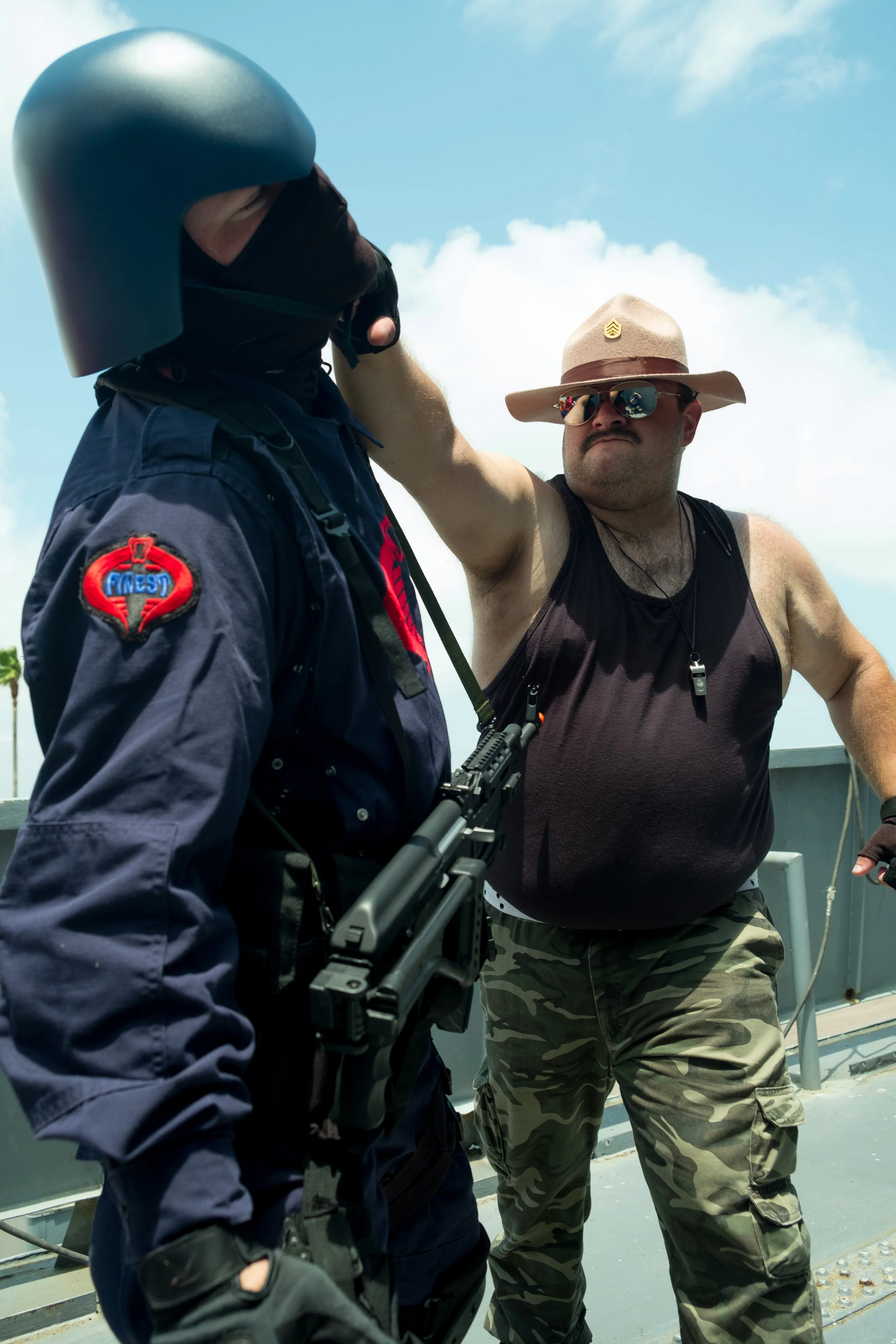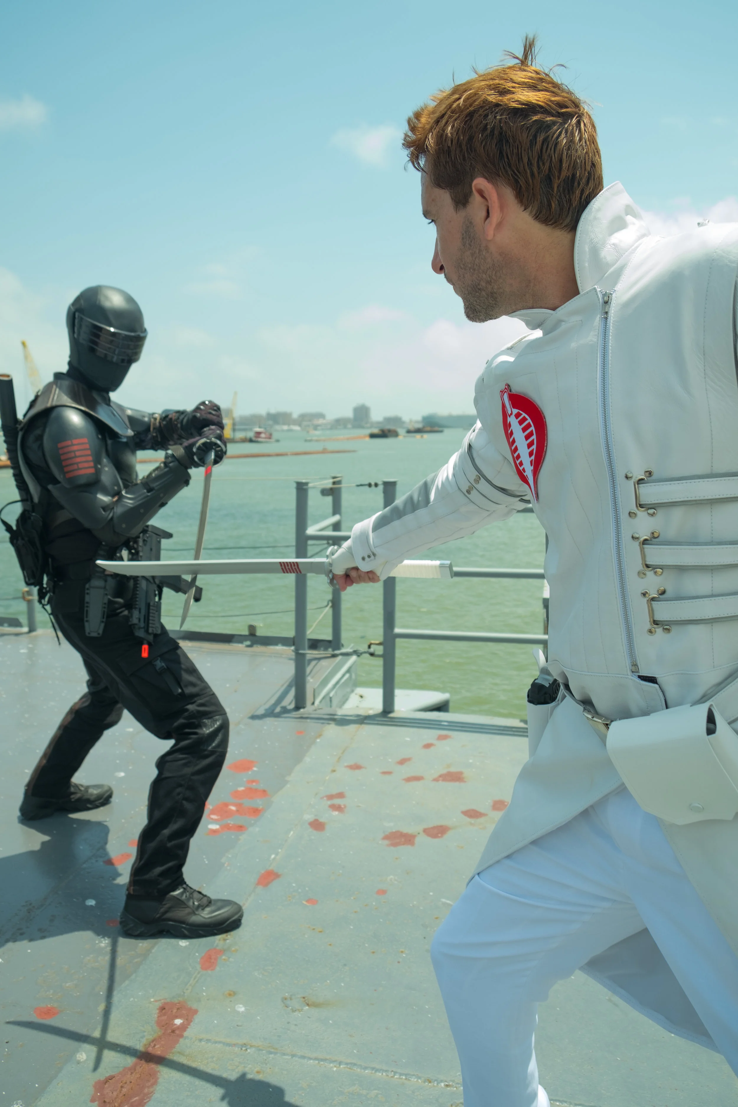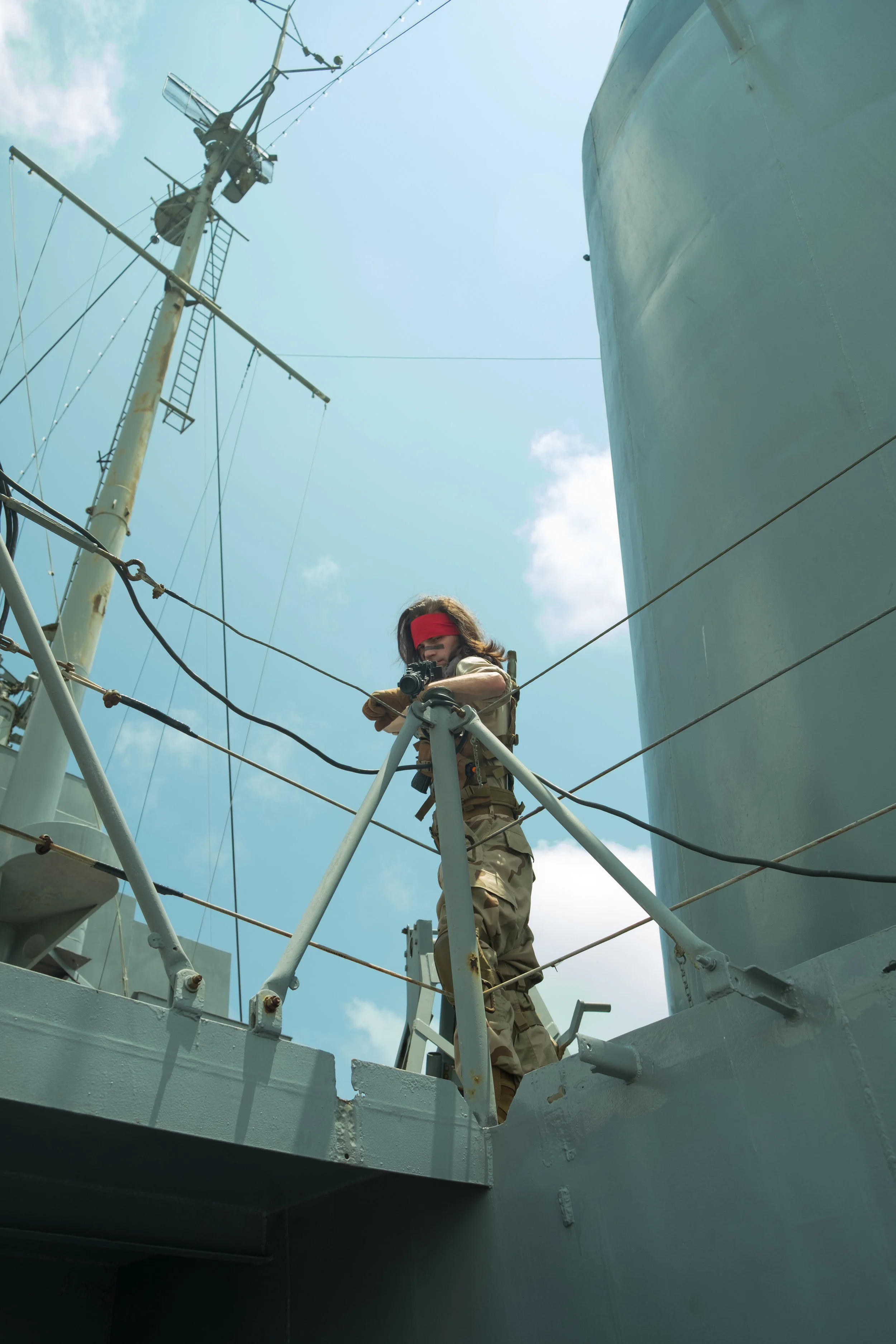 The bulk of the shots were done on the USS Stewart. There was a bit more room to get interesting angles and fight scenes. Though during the day I had to make a point to stay on my feet as much as possible as trying to kneel on the deck of the ship would quickly have me going "ow ow ow" due to the heat. We even waited until nightfall to get more of the inside shots since otherwise it would basically be like an oven in most of the ship.